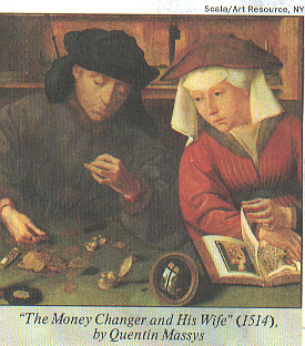 And so, the first Halpin (Chalphen or Chalphin) very likely, if not certainly, engaged in changing money as his occupation. He would have made transactions of converting the currency of one country or region to that of another country or region. For this work, he surely received a commission, which was the source of income for his family. In the past, it was not uncommon for regions in a country to have different currency from other regions, as well as there being different currency from country to country. The occupation was immortalized in the painting belwo done in 1514 by Quentin Massays.